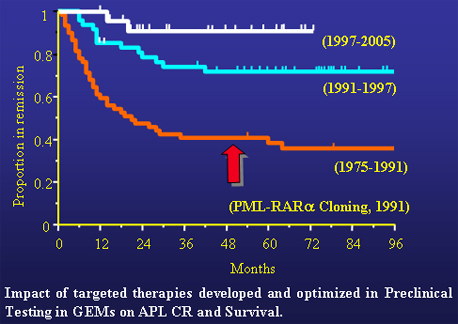On the basis of these convincing results, clinical trials combining both As2O3 and RA were subsequently performed in many academic enters in China, Europe and eventually in the U.S. Today, the As2O3 and RA combination is considered the standard of care in the treatment of t(15;17) APL. These two drugs specifically target the PML-RARa fusion protein by opposing its aberrant transcriptional activity and targeting it for degradation. As2O3 and RA are offered at presentation to t(15;17) APL patients as front line therapy with limited toxicity, in the absence of chemotherapy as induction or consolidation treatment. With these two drugs, curative complete remission is obtained in 100% of cases leading to disease eradication. Hence, the "targeted therapy devoid of chemotherapy" of APL has come of age. Once again, the preclinical effort in the mouse decisively informed and predicted clinical outcome.
