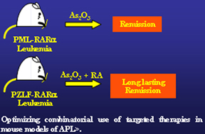 On the basis of these examples, novel therapeutic modalities could be tested as well as combinatorial treatments were optimized by utilizing these APL mouse models as a preclinical predictive engine toward APL eradication. . A decisive home run in this respect was the realization that As2O3 and RA in combination were tremendously effective in PML-RARa leukemia in the mouse.